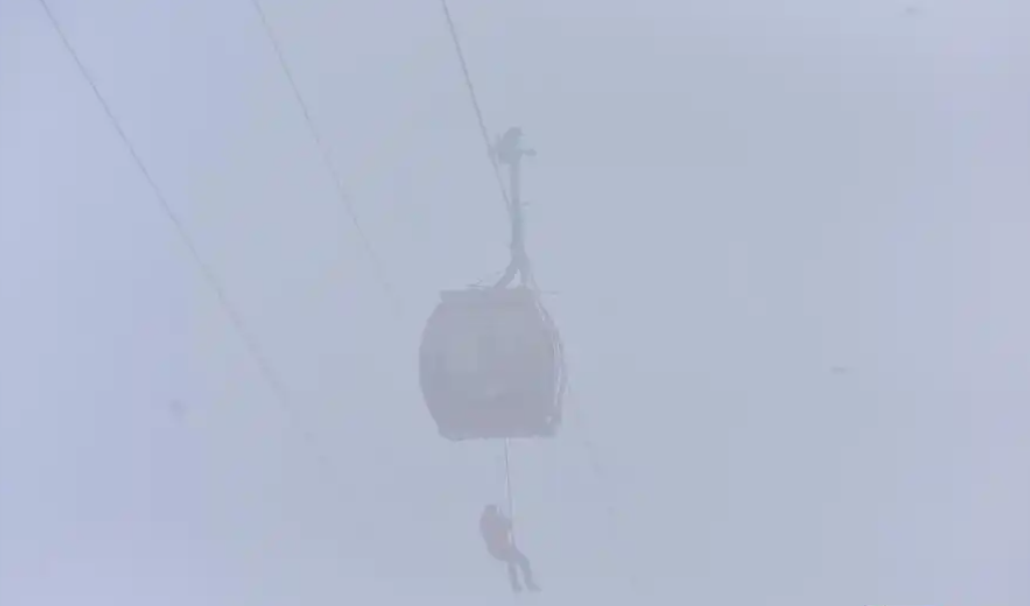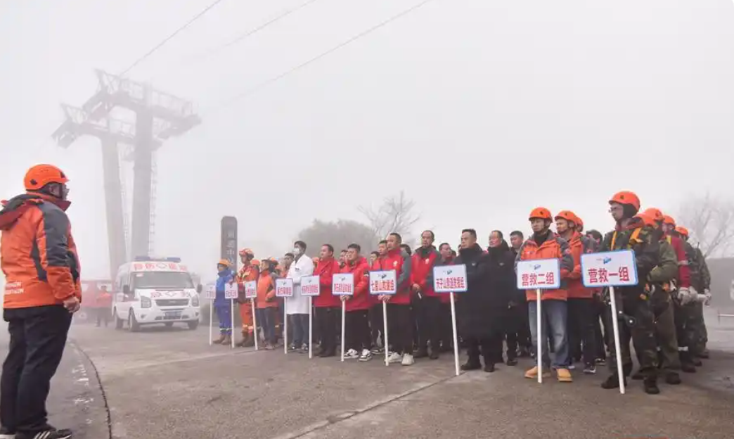 演習(xí)正式開始,運(yùn)行中的天門山索道突然停止,模擬轎廂中的乘客被困。今日山頂飄雪,演習(xí)現(xiàn)場大霧彌漫,能見度極低,這為救援行動增添了額外的難度和緊迫感。雖然現(xiàn)場氣溫接近0°,但救援人員已經(jīng)大汗淋漓。
