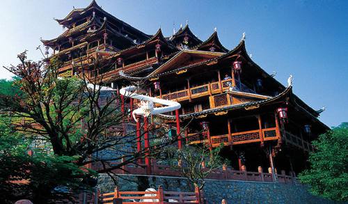 九重天世襲堂是土家風(fēng)情園的精華和靈魂所在。該建筑由土家民間藝人李宏進(jìn)設(shè)計,依80度陡坡而建,高48米,共9重12層,整個樓房全部用木栓連接,沒有一顆鐵釘,堪稱土家族建筑史上的奇跡。2002年9 月22日,九重天吊腳樓被載入世界吉尼斯世界紀(jì)錄,認(rèn)定其為目前中國最大、最高、最完美的木質(zhì)結(jié)  土家風(fēng)情園構(gòu)吊腳樓。