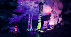 更絕的是,鵝管和鐘乳石倒映在水中,上下映照、渾然一體、形成了一座五光十色的巨大金山,光芒四射、龍鱗點(diǎn)點(diǎn)。她離奇多變的光影、五彩繽紛的顏色、千姿百態(tài)的形狀、加上水滴池面、洞中的天籟之音,形成了神秘之境讓你感到撲朔迷離,如在夢(mèng)中、疑似天堂。當(dāng)您走近她時(shí),就體會(huì)到什么是人間仙境,什么是滄海桑田;當(dāng)您聆聽(tīng)她時(shí),就知道什么是余音繞梁,什么是仙樂(lè)飄飄。那感覺(jué)、那韻味豈是語(yǔ)言能描述出來(lái)的。