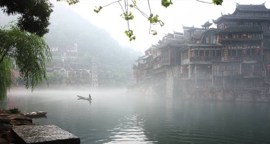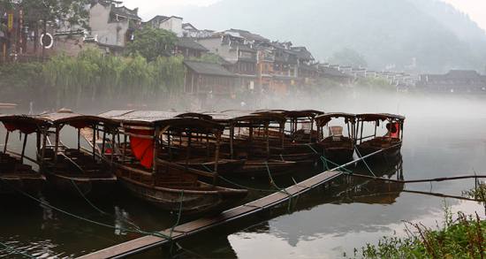 沱江河是古城鳳凰的母親河,她依著城墻緩緩流淌,世世代代哺育著古城兒女。坐上烏蓬船,聽(tīng)著艄公的號(hào)子,看著兩岸已有百年歷史的土家吊腳樓,別有一番韻味。順?biāo)?,穿過(guò)虹橋一幅江南水鄉(xiāng)的畫卷便展現(xiàn)于眼前:萬(wàn)壽宮、萬(wàn)名塔、奪翠樓……一種遠(yuǎn)離塵世的感覺(jué)悠然而生。沱江的南岸是古城墻,用紫紅沙石砌成,典雅不失雄偉。城墻有東、北兩座城樓,久經(jīng)滄桑,依然壯觀?! °铀宄?,城墻邊的河道很淺,水流悠游緩和,可以看到柔波里招搖的水草,可以撐一支長(zhǎng)篙漫溯。沿沱江邊而建的吊腳樓群在東門虹橋和北門跳巖附近,細(xì)腳伶仃的立在沱江里,象一幅永不回來(lái)的風(fēng)景。