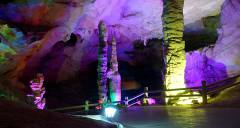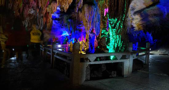 波月洞的“鵝管”長短不一,參差錯落,密密匝匝,直掛天穹,在逆光燈照下,如萬千瑪瑙翡翠垂吊空間,晶瑩剔透,閃閃發(fā)光;觀之,不能不驚吧大自然神奇的創(chuàng)造力。